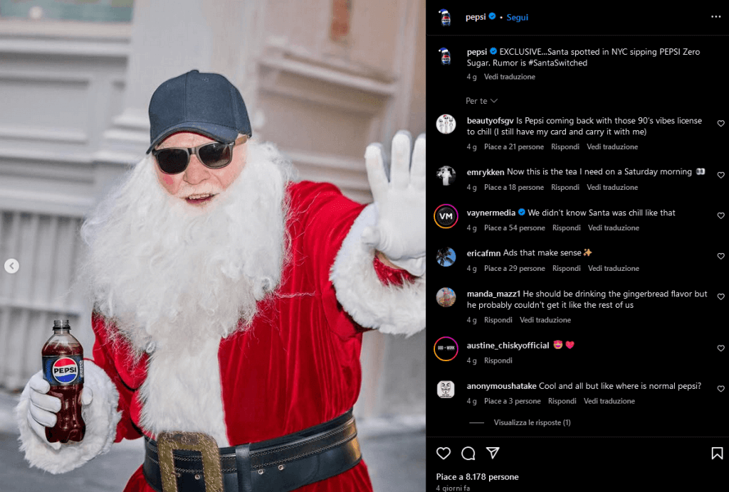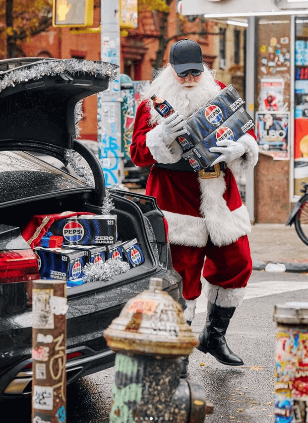 La campagna di Pepsi gioca proprio con l’iconografia del suo principale rivale. Nei video e negli scatti promozionali vediamo Babbo Natale paparazzato a New York mentre si gusta una Pepsi Zero Sugar invece che la classica Coca Cola.