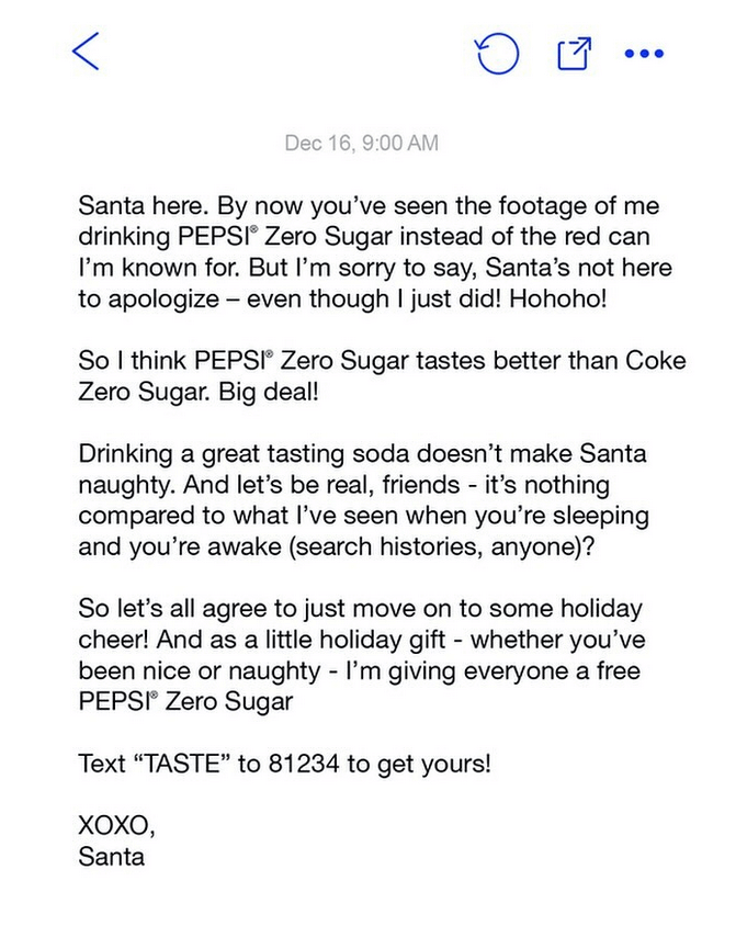 Qui Babbo Natale. Ormai avrete visto il filmato di me che bevo Pepsi Zero Sugar invece della lattina rossa per cui sono noto. Ma mi dispiace dire che Babbo Natale non è qui per scusarsi, anche se l’ho appena fatto! Hohoho!