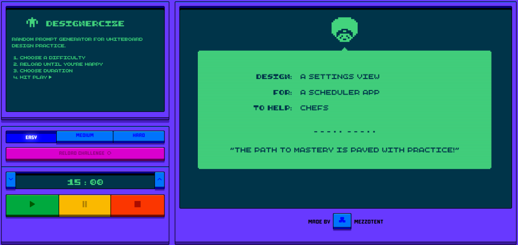 Dopo aver impostato la durata dell’esercizio (ad esempio 15 o 30 minuti), il sito genera dei brief casuali stimolanti che combinano tipologia di progetto, un settore e alcuni vincoli specifici, ad esempio “progetta l’interfaccia delle impostazioni di un’app di pianificazione che aiuti gli chef”.