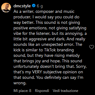 La maggior parte dei commenti al post di lancio, infatti, sono negativi. C’è chi afferma che il suono ricorda “un messaggio di errore” come quelli di Windows, ad altri crea un senso di ansia oppure è semplicemente fastidioso e non si integra per niente con i Reel di esempio.