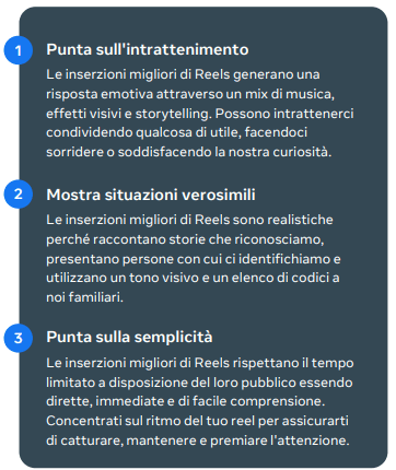 I Reel, infatti, sono il contenuto che funziona di più sulle piattaforme Meta, rappresentando oltre il 60% del tempo trascorso su Facebook e circa il 50% del tempo su Instagram. Secondo la guida, l’85% delle persone intervistate ha iniziato a seguire un brand dopo aver visto un Reel, e il 79% ha acquistato un prodotto o servizio dopo aver visto un contenuto di questo genere.